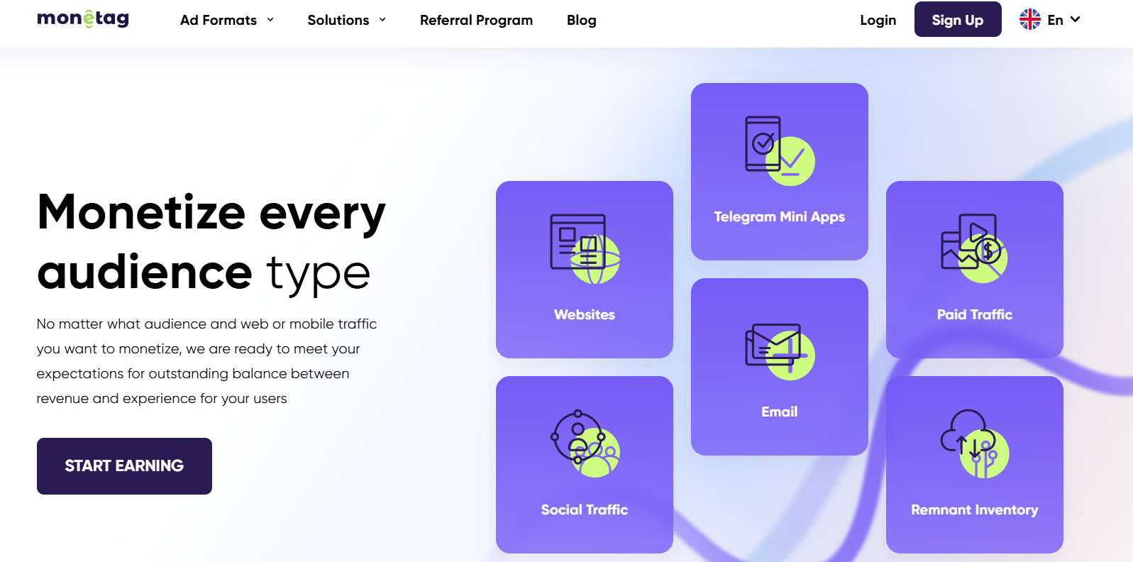 Monetag is a TMA monetization platform designed to monetize all types of traffic, including web, mobile, in-app, social, and free and paid sources.