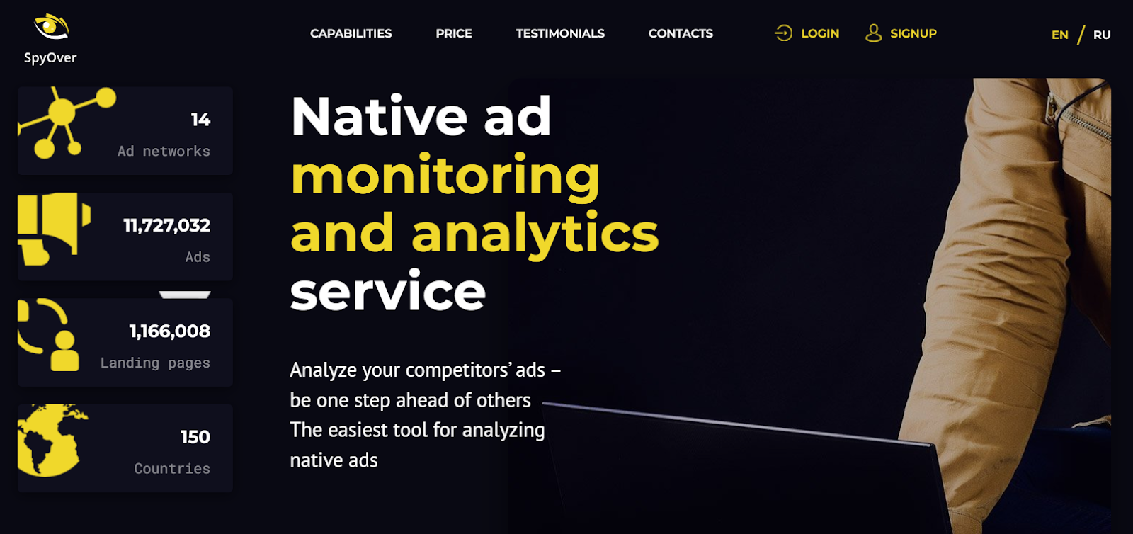 SpyOver is one of the largest native spy tools in terms of GEOs, it covers 150+ countries. Furthermore, it has 11 million ads to search and provides sorting by 70 affiliate networks, 8 trackers as well as 6 devices and 5 main browsers. It allows mass ads downloading as well as translates ads from any language to English!