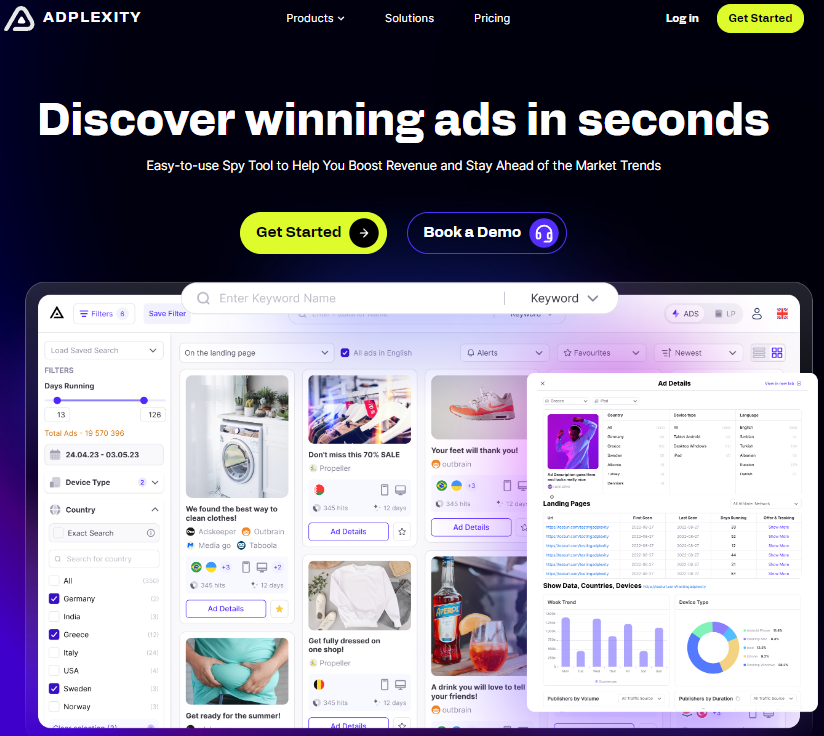 The most affordable spy tool AdFlex offers coverage of over 60 countries with 80000 ads added daily. It also provides a possibility to track competitors’ ads based on all the possible metrics, from OS to impression and timelines. Furthermore, you can get access to pre-tested landing pages and download several pages in one folder!