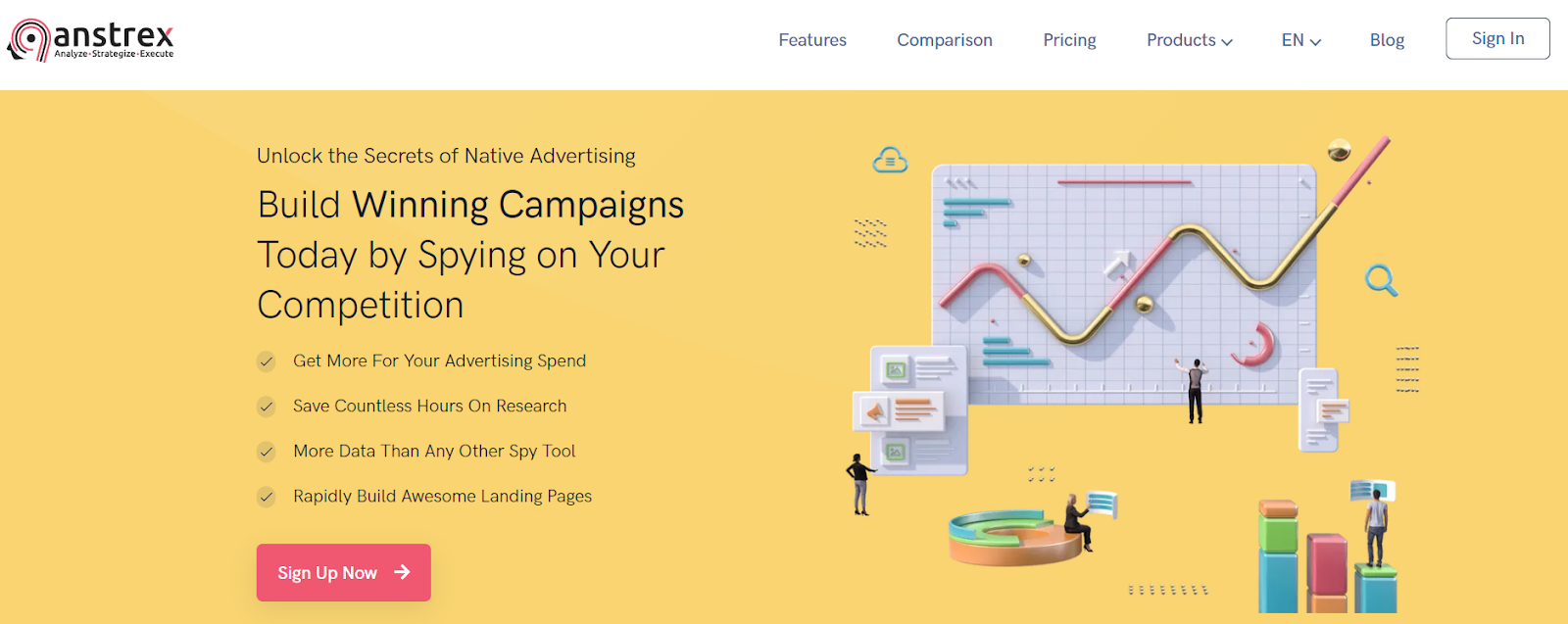 Anstrex is one of the biggest spy tools, including not only native ads, but push, pop and TikTok ads as well. It covers more than 80 countries and 10 million ads with more than 156 thousand advertisers from all over the world. In terms of unique features, they offer an opportunity to filter ads by technology like WordPress, Adsense Arbitrage, etc.