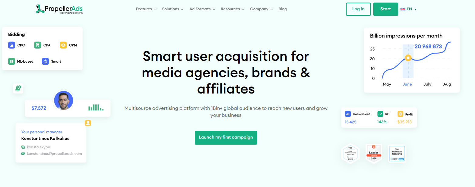 Платформа PropellerAds была создана как для аффилиатов, так и для паблишеров еще в 2011 году и стала надежным решением для многих. Объем трафика впечатляет — ребята утверждают, что у них более 12 миллиардов ежедневных показов, что предоставляет огромные возможности для рекламы.