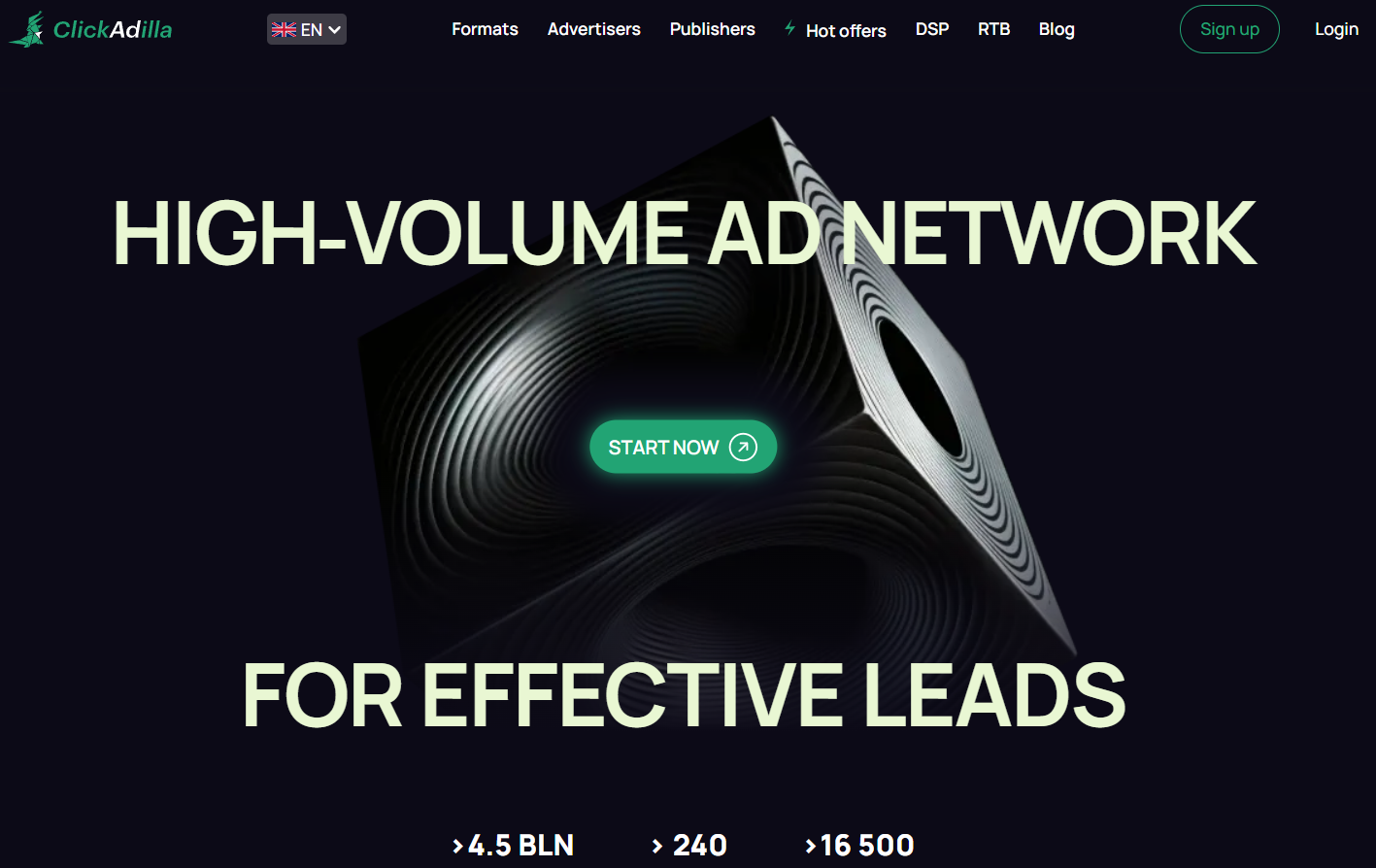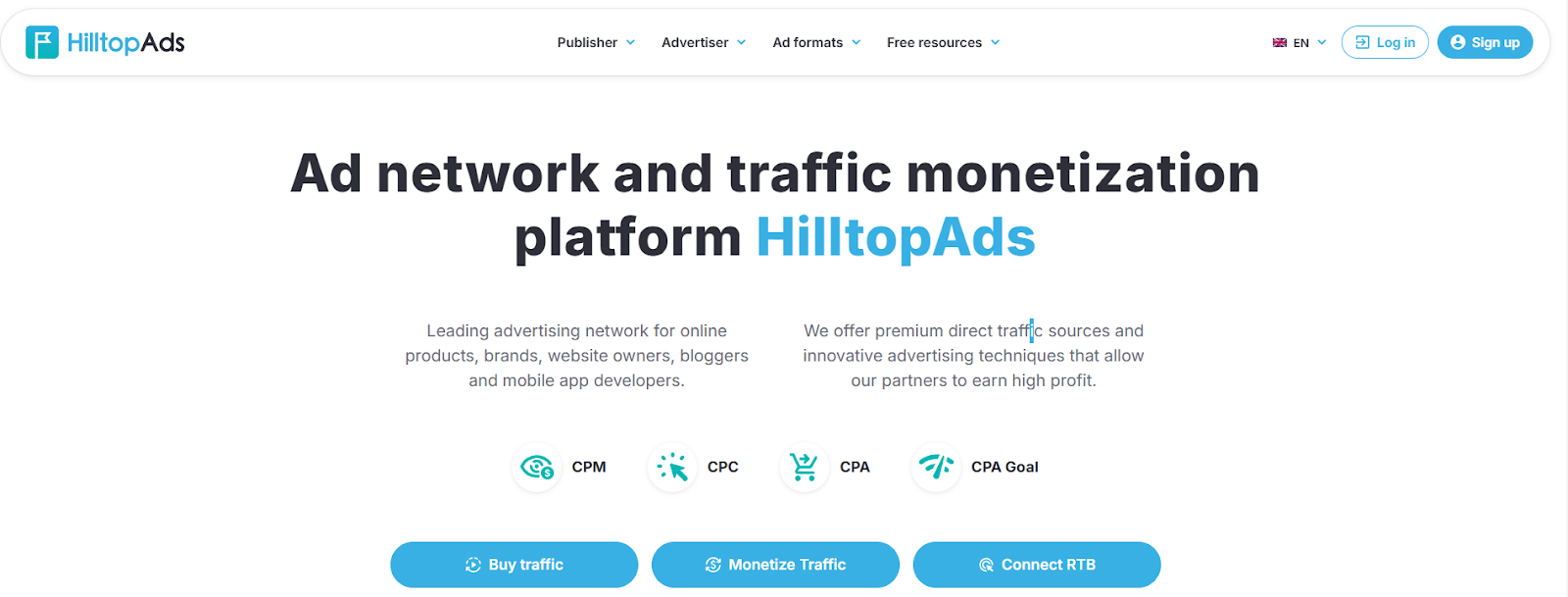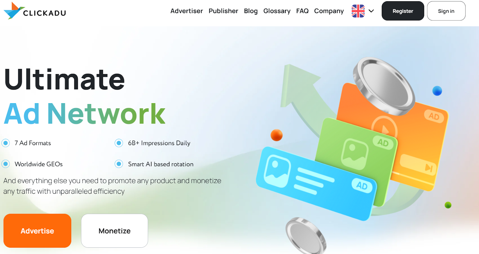 Эта self-serve платформа генерирует более 4,5 миллиардов показов рекламы ежедневно, предлагая различные форматы, включая попандер, видео, инпейдж, пуш, баннеры, direct links, нативка, interstitial, gallery и in-app.