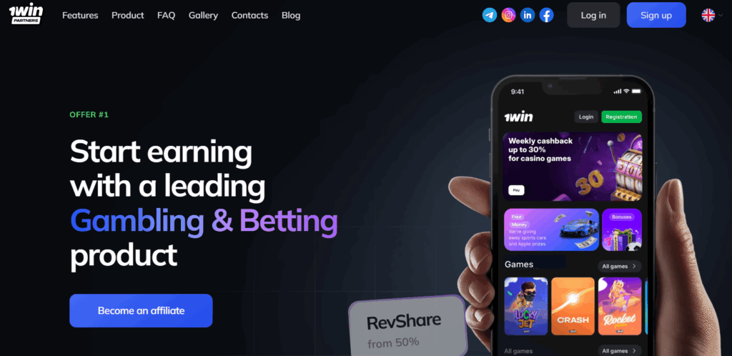 1win is the official affiliate program of the 1win brand, offering betting services, eSports, slots and mobile solutions. It has commissions starting from 50% RevShare and CPA up to $250 per player.