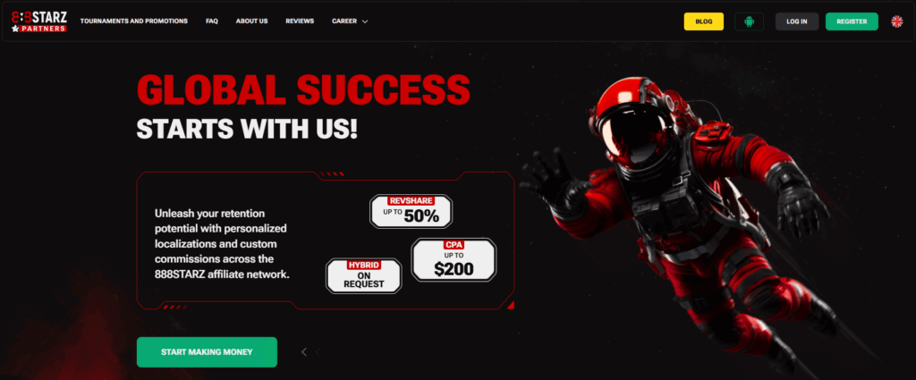 888Starz Partners promotes a fast-growing international brand with flexible commission offers: RevShare up to 25%–50%, CPA up to $200.
