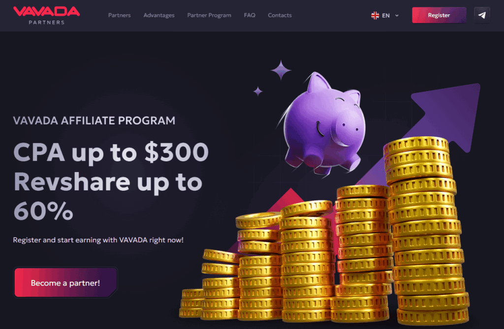 Vavada Partners is the official affiliate platform for the VAVADA casino and sportsbook, active since 2017. The program provides generous commission options, including RevShare rates of 50-55% and CPA payouts of up to $300.