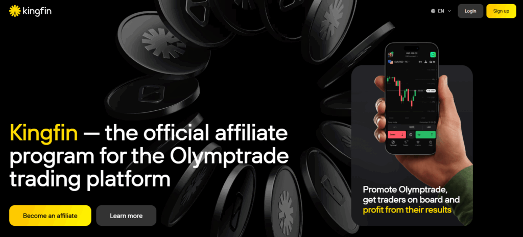 Kingfin is the official affiliate program, designed to deliver valuable opportunities for partners. The platform provides generous commission options, including RevShare of up to 80%, CPA rates reaching $250, hybrid models, and customized plans for individual partners.