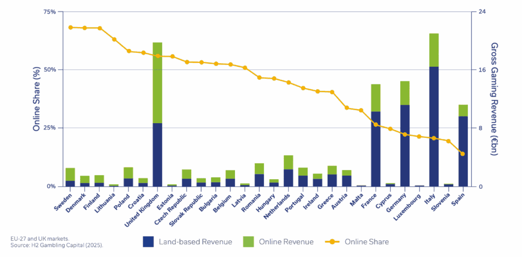 Germany is Europe’s largest economy and one of the biggest Gambling countries. However, the market is strictly regulated. The 2021 Interstate Gambling Treaty created a national licensing system, which opened the door for online casinos and betting platforms. But the government also capped online slot bets at just €1 per spin, and limited monthly deposits on casino games to €1,000. These strict rules made many players go to offshore sites, so the legal market captures only a fraction of what Germans actually spend on Gambling. Still, the numbers are impressive.