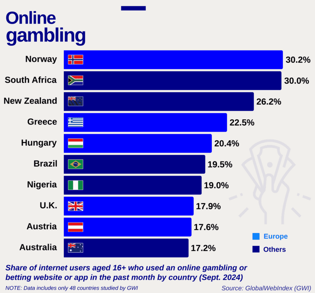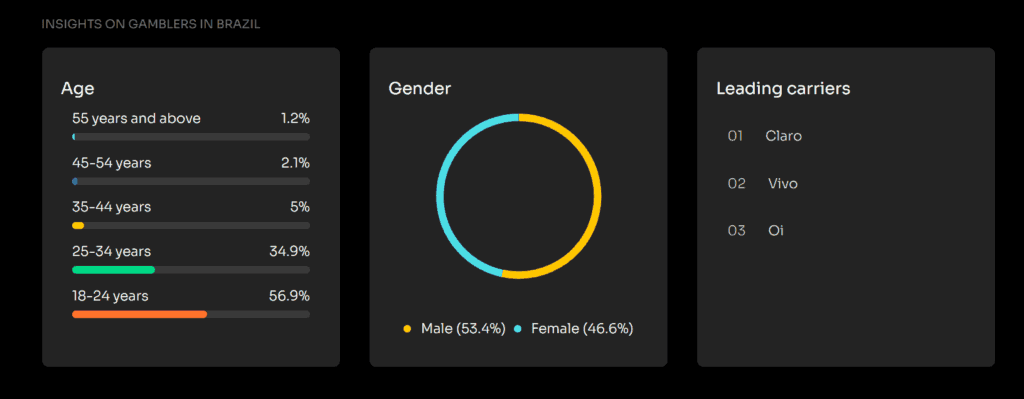 Brazil has only recently become one of the most gambling countries. For 70 years, Gambling was illegal, but in December 2023, the government passed a comprehensive law legalising fixed-odds sports betting. Brazilians, with their fierce passion for football, demonstrated extraordinary interest, and within months of legalisation, the country had attracted over 100 licensed Gambling operators. Now, Brazil’s market is reaching 22.1 million active bettors and is expected to generate approximately $7.02 billion in revenue this year. As we already mentioned, football is the main driver for Brazilians. They bet on the Premier League, Champions League, and their own Serie A. Over 70% of all wagers are placed on mobile. Interestingly, the most active Gambling audience is young people aged 18-24, and the ratio of women to men is almost equal.