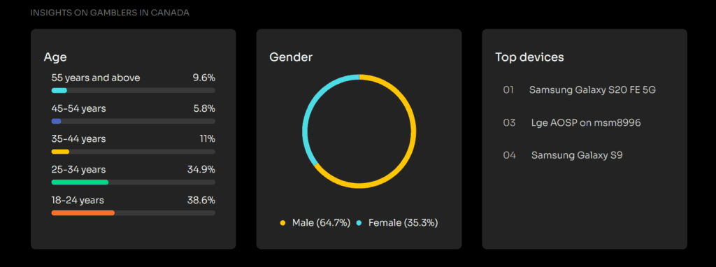 If you want to run traffic in Canada, focus on the male audience. Canadian gamblers are young, aged 18-34. They prefer sports betting and bet mostly on basketball. Online casinos, bingo, and poker are also popular.