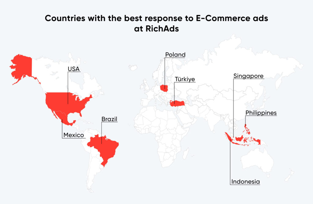 Among the best converting traffic sources for E-Commerce offers are Telegram ads in Mini Apps and bots, popunders and native formats, well represented at RichAds. The ad formats possess active audiences across the globe, affordable rates and high CR with less competition than on popular platforms like FB, Search ads and SEO organic.