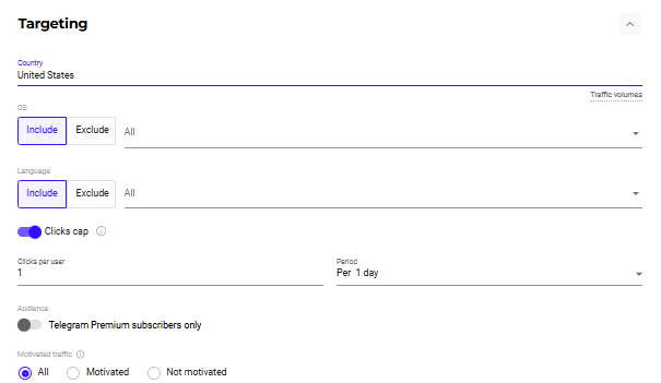 You can also select 1-2 clicks per person a day not to overheat the audience, that’s a common approach to gain better results. Don’t forget that you can also choose if your audience will be motivated or not!