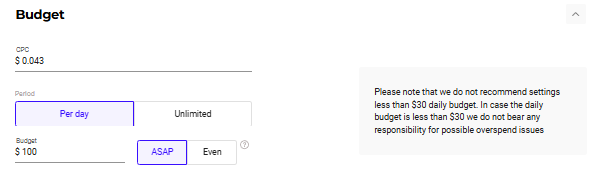 As we’ve mentioned before, prices for the USA start from $0.04 per click, yet it’s better to consult the manager on the optimal bid to get enough traffic for your test. In terms of budget — decide what’s your desired price per conversion and test a budget that equals 10 conversion prices! This will help you evaluate the efficiency of your campaign.