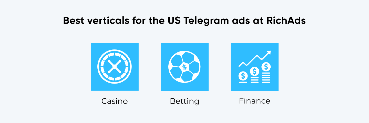 Globally, you can test any desired vertical to launch on Telegram ads in the USA, yet there are several niches that show best results at RichAds constantly. Best niches include Casino, Betting and Finance, make sure you test them!