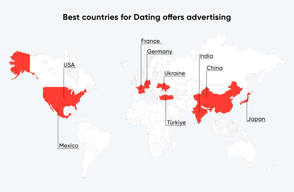 Many regions worldwide show great demand for Dating offers, making them one of the most profitable verticals in affiliate marketing. Some geos keep the tendency for years, while others might light up with high response seasonally, peaking with interest for a limited period of time.