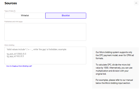 Now you can do optimization via white– or blacklisting, just ask your manager to help with the best sources for your ad campaign. It’s actually a good idea to start with blacklisting to cut off only non-working expensive sources rather than rely on working ones and decrease traffic amount!