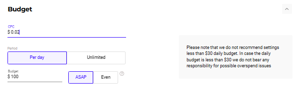 As for the budget, test at least 10 conversion prices to understand whether your campaign works properly or not. It’s also better to choose an “ASAP” budget type to start getting traffic as soon as your bid is a winning one!