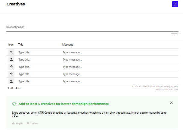 It’s crucial for any ad type as this way you’ll be able to test several approaches within one campaign and choose the ones with better CTRs! Test various icons, CTAs or banners, you can order them at RichAds for free, even localized ones!