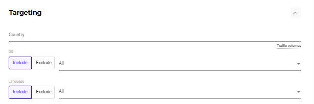 Add desired country, OS and language, yet it’s better not to choose the parameters that are too specific, if you just start with testing. Let the campaign run for some time to see which OS and language work best!
