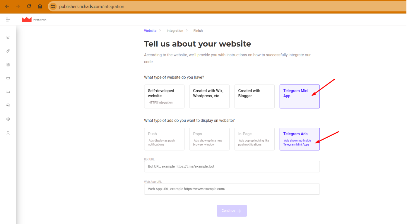 - Choose “Telegram Mini App” and “Telegram ads”.