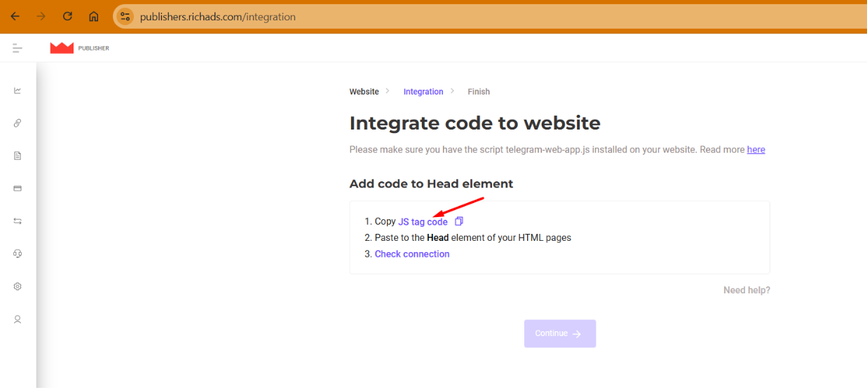 - Copy personalized JS code, then add it to the Head element in the HTML attached to your Telegram mini app.