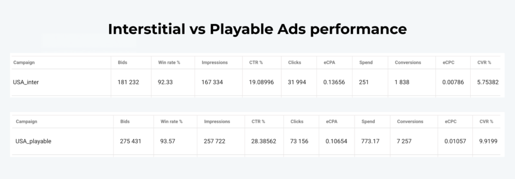 We offered our advertisers to test the Playable Ads in addition to their current interstitial campaigns, setting the targeting parameters alike. Starting from just $3 CPM to launch a campaign, they were intrigued how well could the interactive ads perform in comparison to their previous promotions. In fact, they were more surprised by the results!