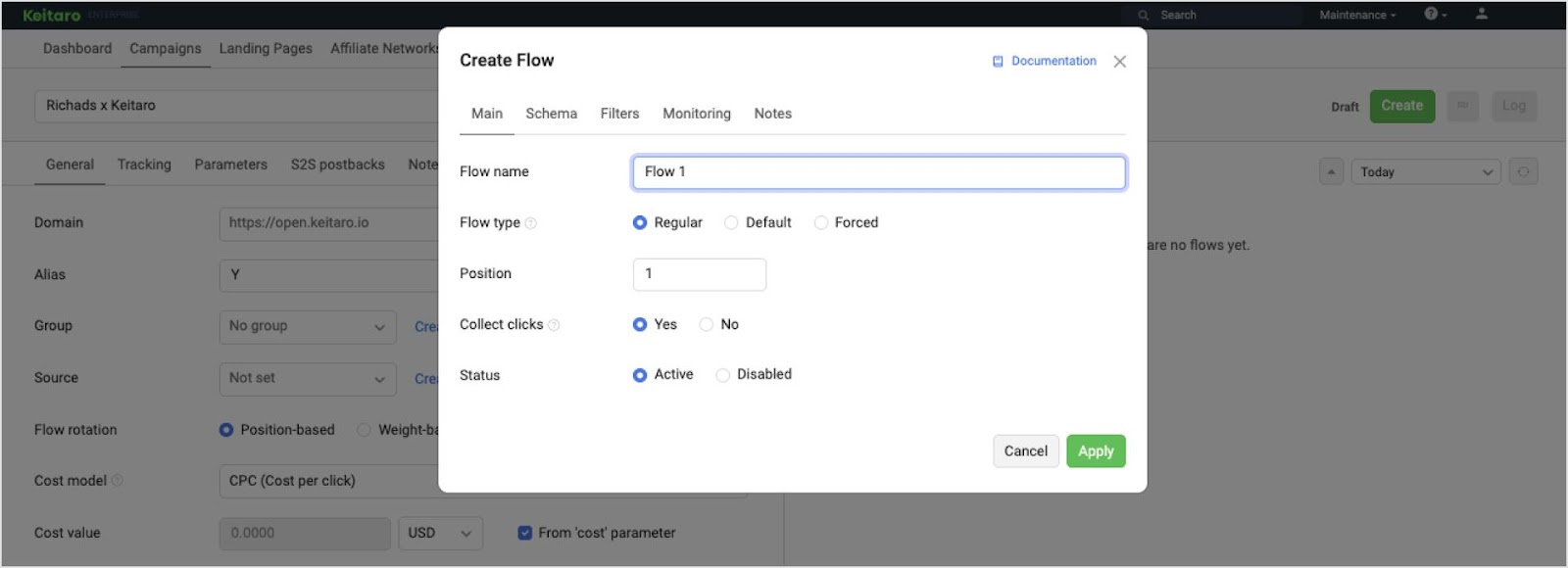 From the Keitaro dashboard, set up campaigns by selecting traffic sources and grouping as needed. Define your flows and cost models, and target your audience based on the goals of each campaign.