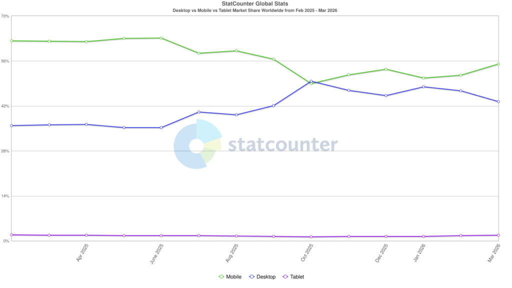 Mobile now accounts for about 55% of all global web traffic. In affiliate marketing, that share can be even higher depending on the vertical and the GEO. It directly affects the volume of potential impressions and clicks, CTR, CR, and ROI.