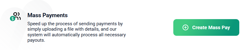 Need to blast payments from one wallet to multiple partners? Use Mass Payments. Just upload a file with the payment details, and the system takes care of the rest.