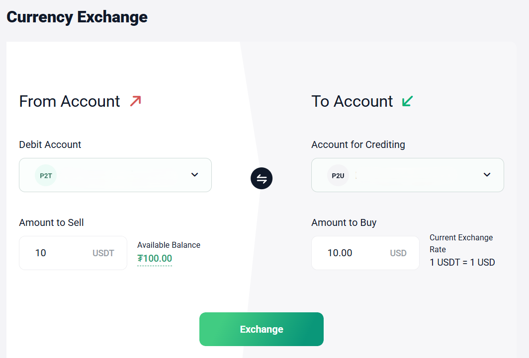 The built-in exchanger lets you swap crypto and fiat at current rates inside the system.