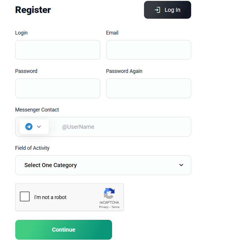 The process is super simple: set login and password, drop your email, choose your preferred messenger: Telegram, WhatsApp, Skype, Viber, and select your industry.
