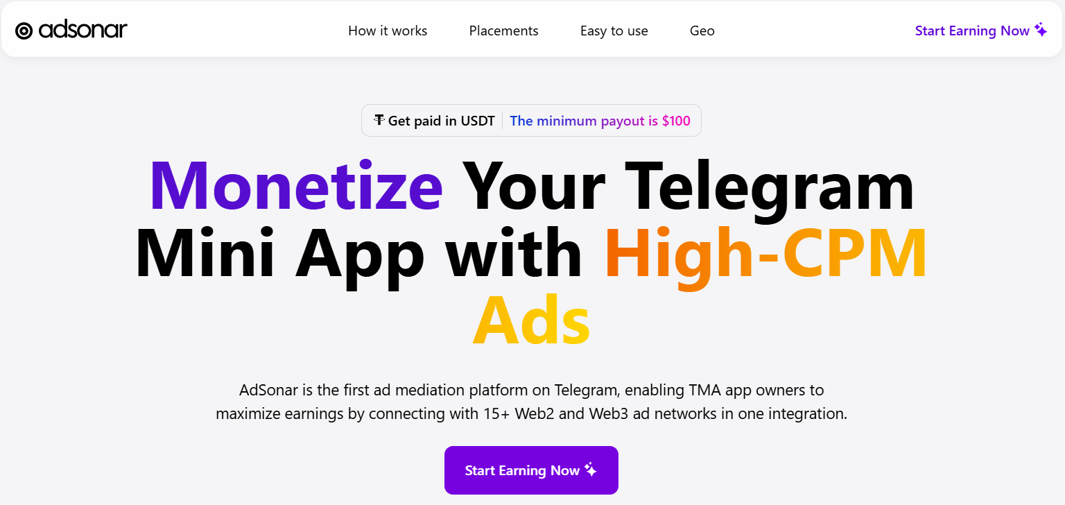 Otra plataforma de ads de Telegram que realmente funciona es AdSonar. Es la plataforma pionera de mediación de Telegram Ads, creada para propietarios de mini apps. Ofrece un coste por impresión muy eficiente gracias a que varias redes publicitarias pujan por cada impresión y permiten que AdSonar sirva los anuncios más rentables para tu audiencia.