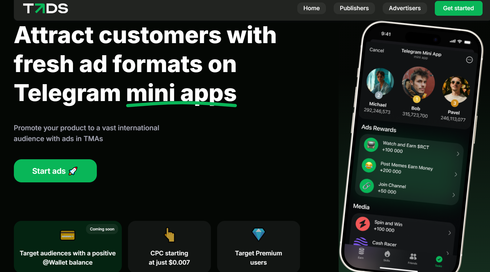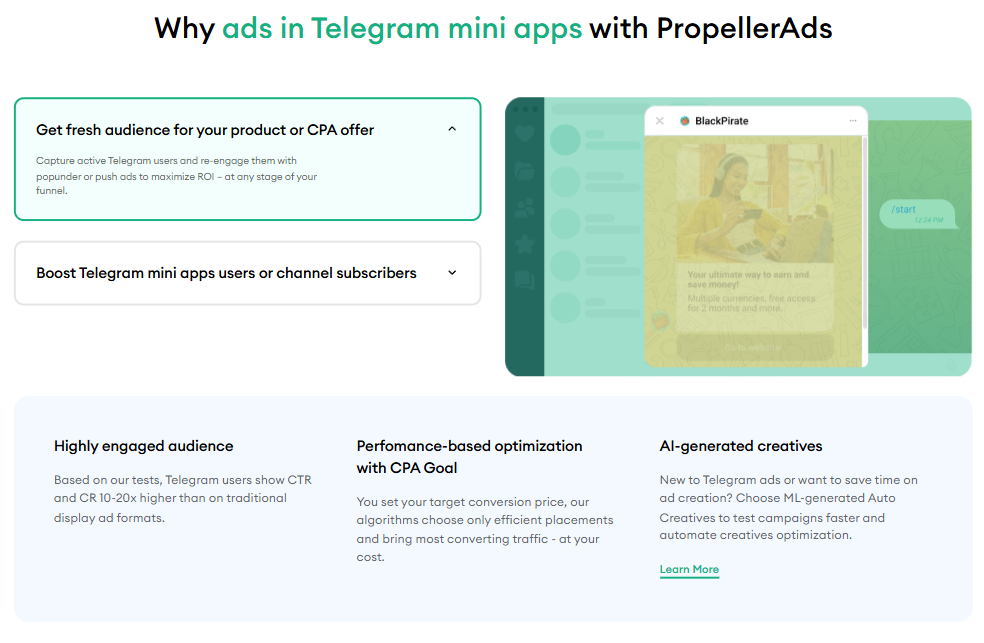 Como ya hemos mencionado, RichAds también es ideal para owners de Telegram Mini Apps y bots y ofrece ventajas importantes que merece la pena destacar.
