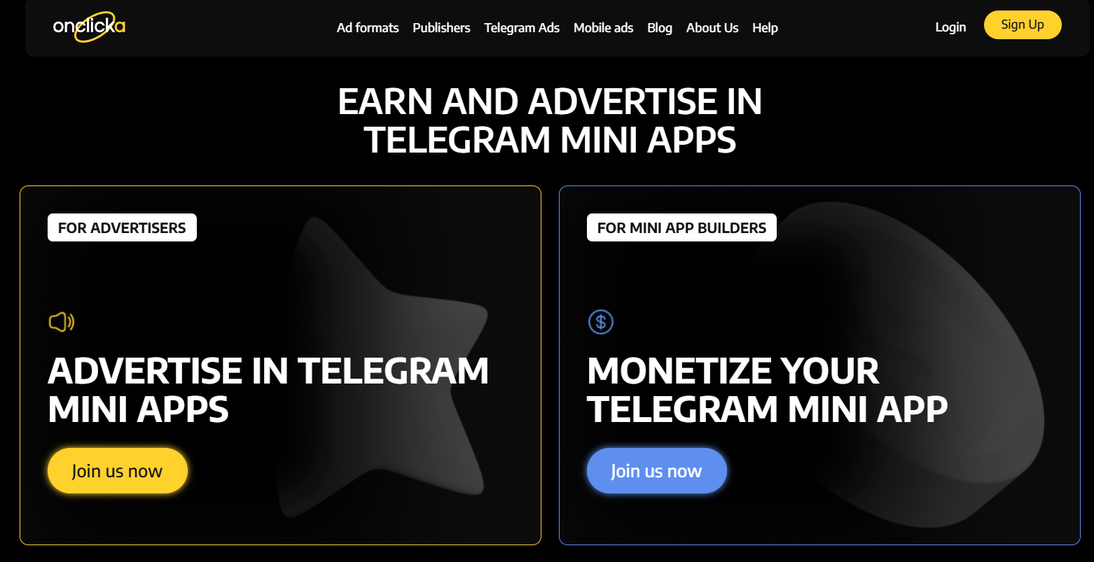 OnClicka es una red publicitaria dinámica pensada para garantizar tráfico de alta calidad, generar más leads y aumentar las conversiones. Esta plataforma de marketing de Telegram se centra en maximizar los ingresos de anunciantes y publishers mediante un targeting preciso de anuncios en Telegram Mini Apps.