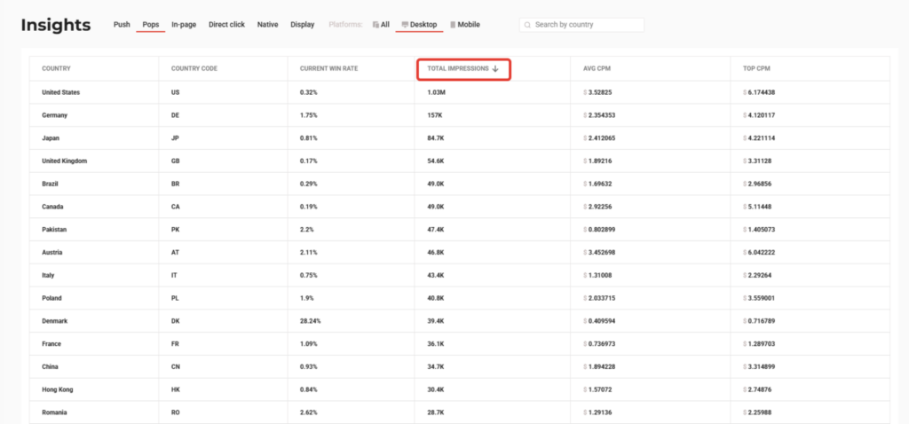 In the RichAds ad network, for major Tier-1 geos like the US, UK, Germany, or Canada, you can tap into hundreds of thousands to millions of impressions, with average CPMs around $3.5 for the US and roughly $2-2.5 for big European countries.