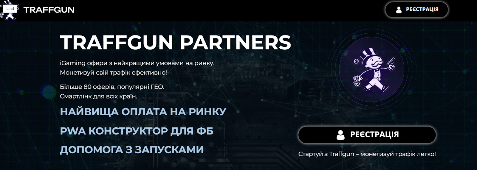 TRAFFGUN PARTNERS — iGaming партнёрка, которая предлагает более 300 офферов на 80+ стран, включая ГЕО от Тир 1 до Тир 3. В сети представлены как классические гемблинг-офферы (казино и беттинг), так и смартлинки под TikTok стримы. Офферы подходят как для новичков, так и для опытных команд.