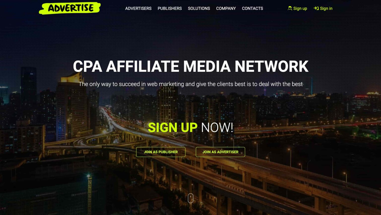 Advertise — это мультивертикальная партнерская сеть. Платформа существует с 2015 года, и на сегодняшний день общее количество офферов составляет 1285 в 190 регионах. Более того, эта сеть предлагает собственный инструмент для удобного трекинга, предоставляющий надежные данные о кликах, конверсиях и доходах.