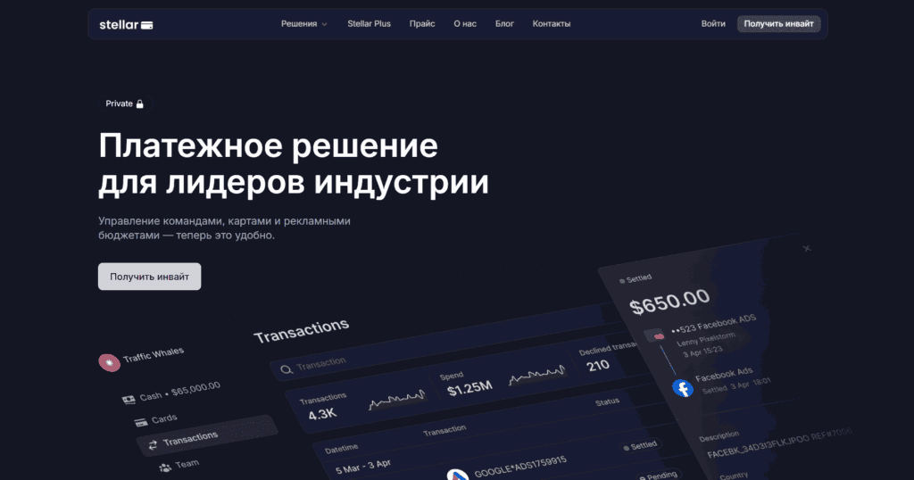 Система от Stellar Card ориентирована на крупные команды с высоким спендом и доказанным перформансом, которым нужно инфраструктурное решении для управления большими бюджетами, автоматизации финансовых процессов и обеспечения безопасности платежей на крупных рекламных платформах, таких как Facebook, Google Ads и Apple Ads.