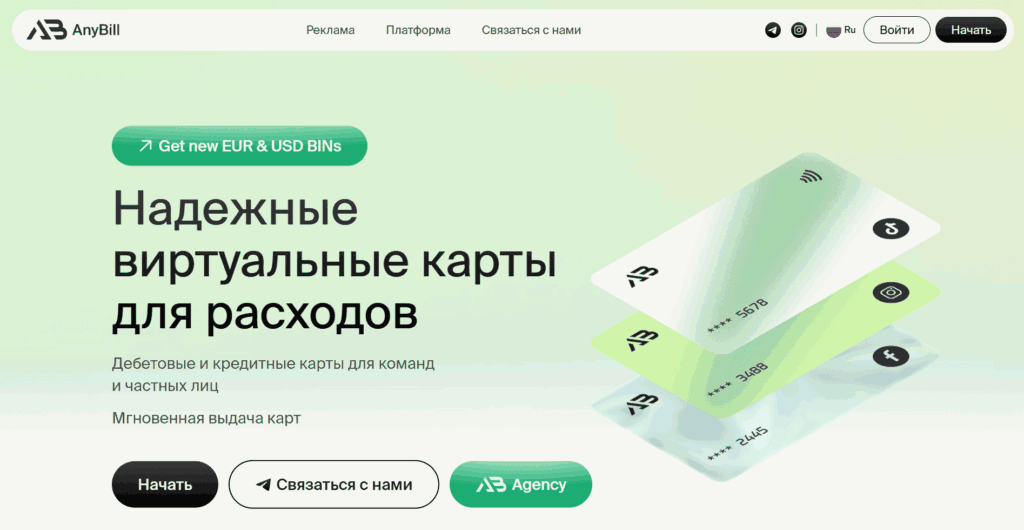 AnyBill позиционирует себя как надежное и удобное платежное решение для арбитражных команд и вебмастеров, и среди всех достоинств стоит отметить именно удобство. Простая регистрация, моментальный выпуск карт и прозрачные условия пополнения делают этот сервис отличным выбором для оплаты рекламы.