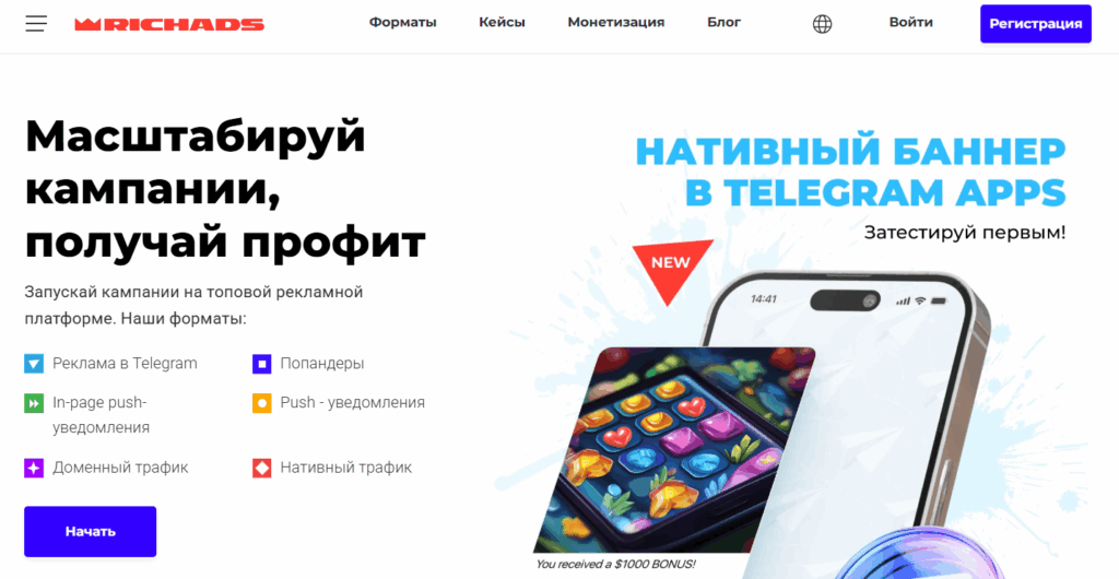 | RichAds | Пуш, In-Page пуш, попандер, нативка, Direct Click, реклама в Telegram | Всемирные | $150 | Продвинутая оптимизация, контроль на уровне источников, реклама в Telegram, отлично подходит для масштабирования |