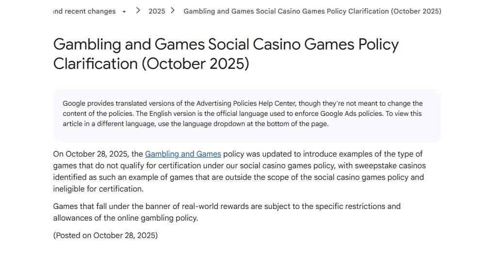 Все изменилось с недавним обновлением политики Google «Об играх и гемблинге» (источник только на английском) от 28 октября 2025 года, где указывается, что sweepstake-казино все же НЕ являются социальными казино. Засчет возможности даже косвенной игры на реальные деньги такие платформы теперь относятся к разряду обычных азартных игр, и будут регулироваться исключительно как таковые.