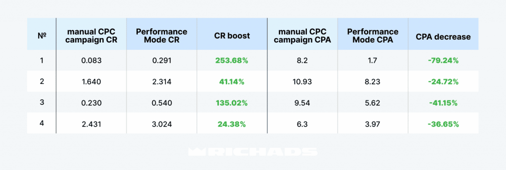 Приведем небольшой пример-сравнение кампаний с ручной оптимизации и оптимизации с Perfomance mode. Конверсии с Перфоманс модом выросли на 229%, а таргет CPA снизилась на 55%.