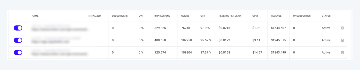 За две недели клиент практически окупил весь свой вклад на закупку трафа. Общий профит составил $4733. Доход за клик варьируется от $0.012 до $0.02, с самым большим профитом от пуш-стайл рекламы — $1843 за неделю.