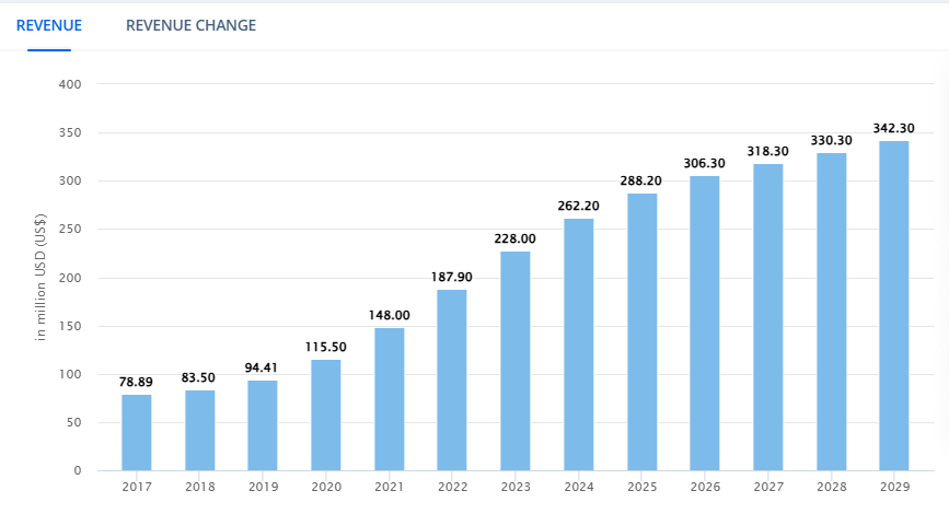 Чтобы не быть голословным, давайте взглянем на данные Statista. Ожидается, что рыночная выручка достигнет 262 миллионов долларов при прогнозируемом годовом темпе роста в 5,48% и объеме рынка в 342 миллиона долларов к 2029 году.