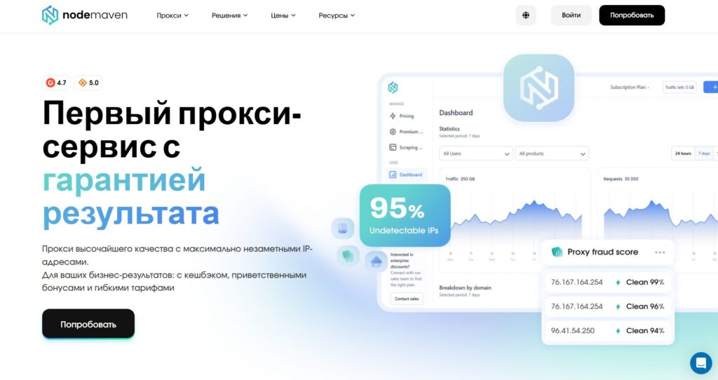 NodeMaven — это одна из лидирующих технологических кампаний, предлагающая к использованию только высококачественные mobile и residential прокси с чистым статусом IP. Глобальное покрытие по гео позволяет точечно таргетировать 150 стран и более 1400 городов, а доля чистых IP в пуле составляет почти 95%! Фильтрация IP в реальном времени и балансировка нагрузки через «липкие сессии» дают возможность использовать максимально эффективные адреса как можно дольше, а уникальная функция Speed Filter от NodeMaven предлагает скорость как у домашнего Wi-Fi.