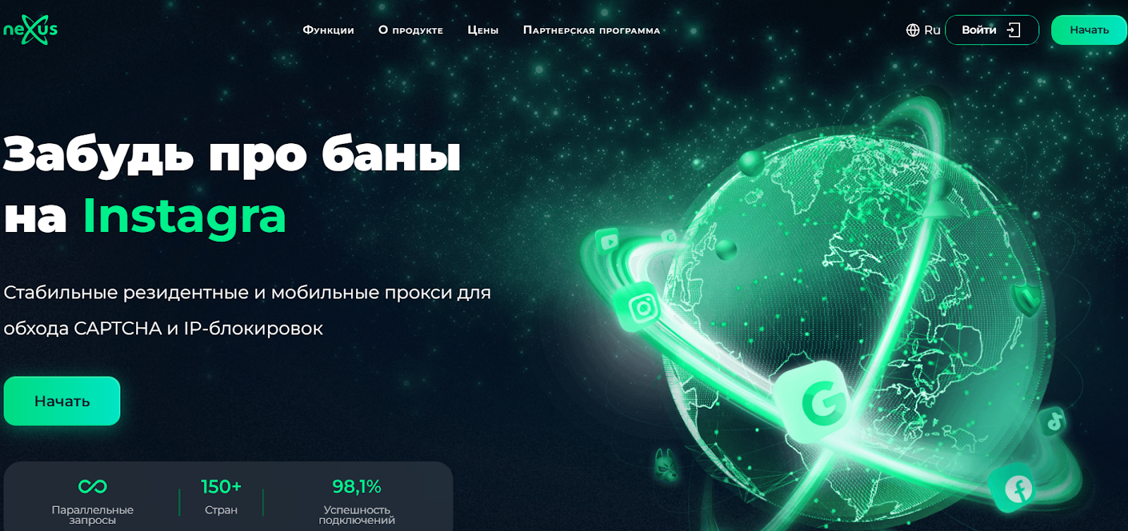 Замыкает наш рейтинг прокси сервисов — Nexusnet. Это платформа, которая предоставляет разные виды прокси (резидентские, мобильные и серверные) с возможностью поддержки протоколов HTTP(S) и Socks, а также IPv4. Она охватывает более чем 150 стран с 98% успешностью подключения и предлагает гибкие тарифные планы, среди которых оплата за трафик и безлимитные тарифы по определённый период.