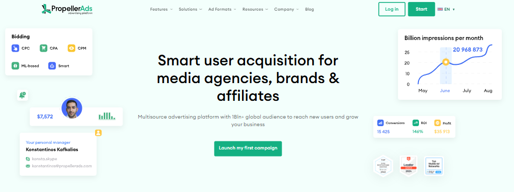 PropellerAds предлагает разнообразие форматов рекламы, таких как push-уведомления, in-page пуши, interstitial, попсы survey exit. С более чем 12 миллиардами ежедневных показов рекламы в 195+ странах, сеть оснащена инструментами оптимизации на базе искусственного интеллекта, такими как CPA Goal, и надёжной защитой от фрода.