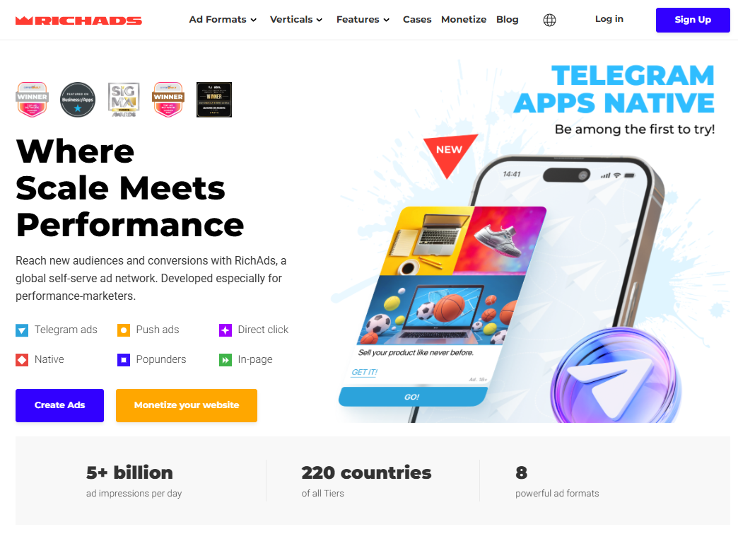 - Форматы рекламы: пуши, in-page пуши, попсы, нативка, direct click, дисплей реклама, а также инновационный формат в Telegram мини аппках (доступен таргетинг по TON-кошельку и премиум юзерам)