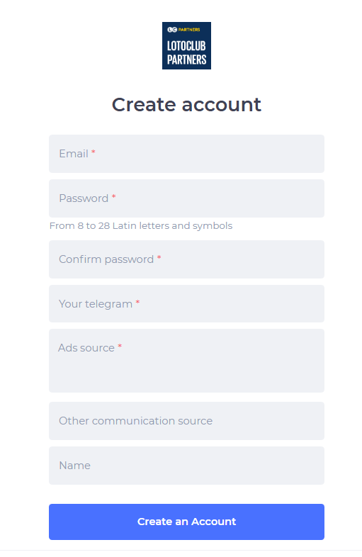 Сам процесс регистрации в Lotoclub Partners максимально простой, нужно ввести базовую информацию —- имейл, пароль, Telegram аккаунт и источник трафика, остальное опционально.