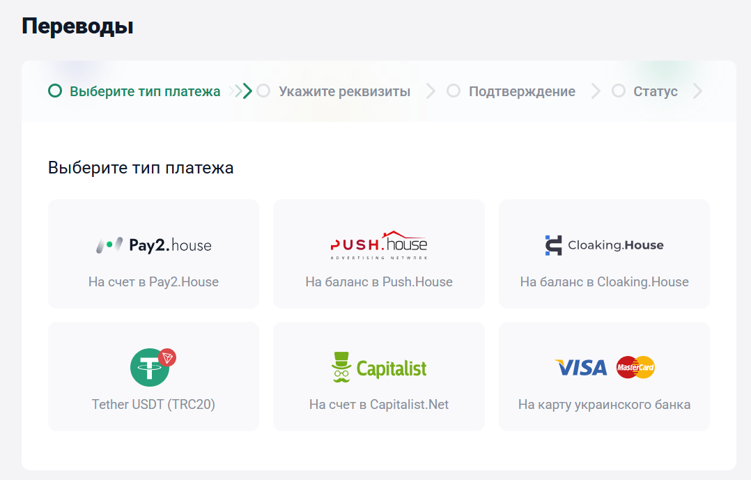 Есть возможность переводов на балансы сервисов, Push.House, Cloaking.House, Tether USDT (TRC20), Capitalist, список будет увеличиваться. - Удобные методы пополнения счета.