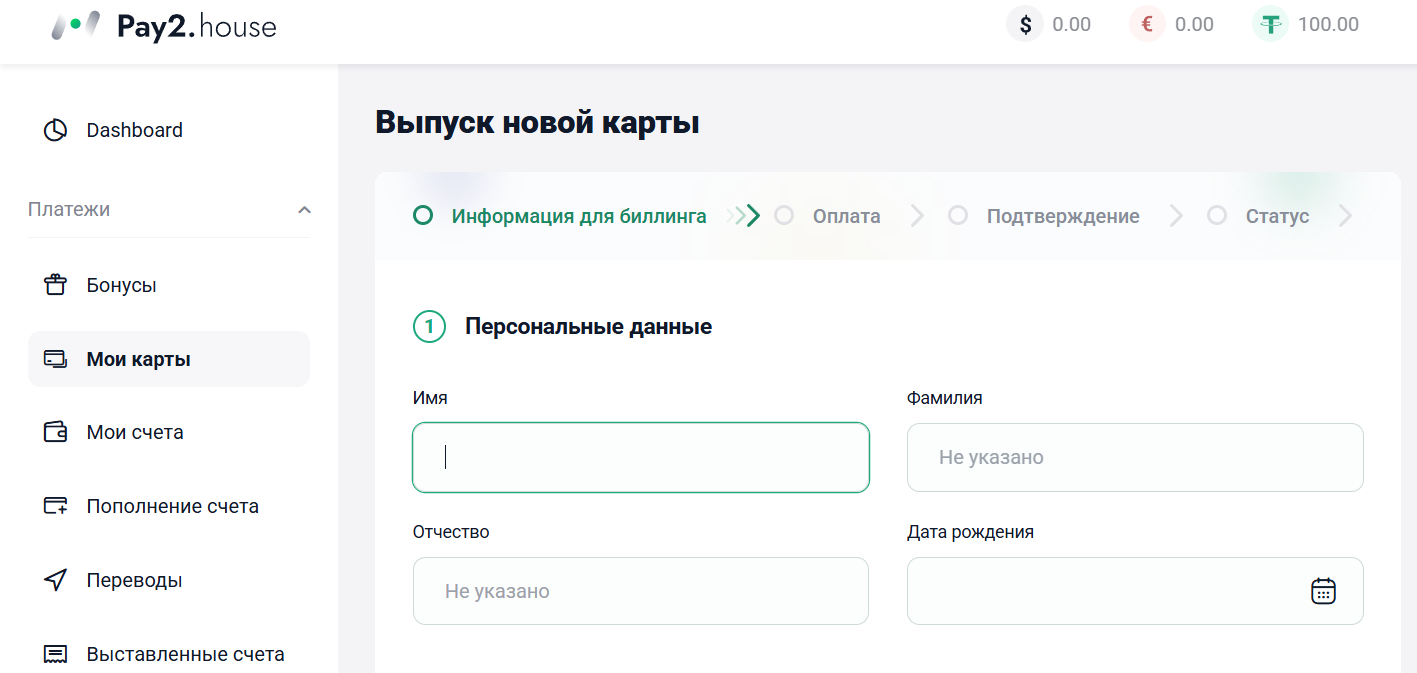 Как упоминали выше, для выпуска новой виртуальной карты в Pay2.house нужно пополнить баланс счета, сумма будет зависеть от выбранного тарифа и количества карт.